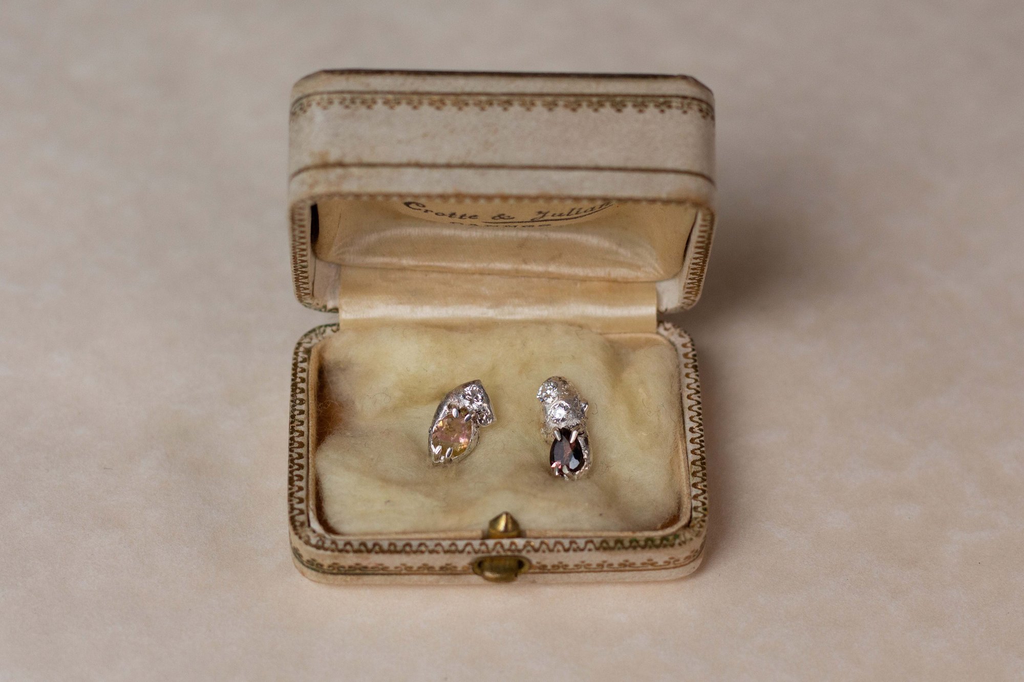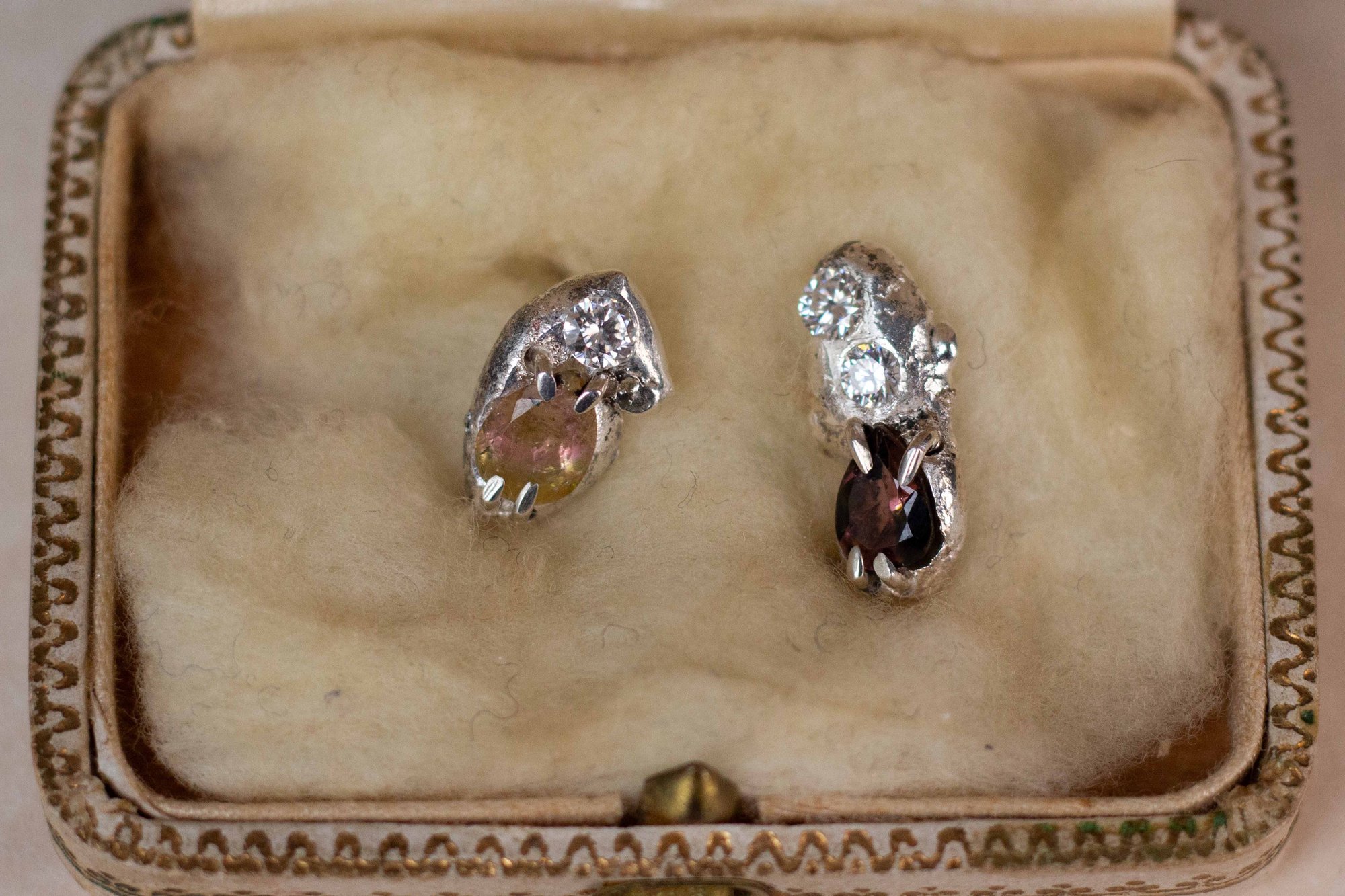 Unique earrings from "Vestigio #1" collection, made from fine silver, moissanites and bicolor tourmaline.